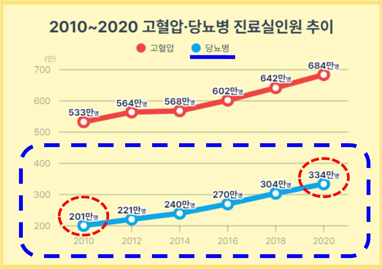 당뇨병 환자는 지속적으로 늘고 있습니다. 특히 최근 10년간 20~30대의 젊은 당뇨병 환자가 늘고 있다고 합니다. 원인은 비만의 증가와 관련있다고 하니 체중 관리도 중요해 보입니다.