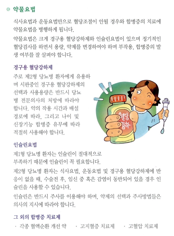 당뇨병은 크게 당뇨병 치료는 크게 보면 식사 요법, 운동 요법, 약물 요법의 3가지 방법이 있습니다. 가벼운 당뇨병은 식사와 운동 요법으로 관리가 가능할 수 있습니다. 하지만 만족할만한 혈당 조절이 되지 않을 때 세번째인 약물 요법을 병행하는 것이 전문가의 의견입니다. 아래는 전문가의 설명이 필요할 수 있어 관련 자료를 제시합니다.